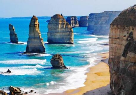 【十二门徒岩】是澳大利亚最著名的地标性景观之一,大约形成于2000万年前,由12块各自独立的岩石群组成。这组岩石群千万年来,在海风和海浪的不断侵蚀下,逐渐形成了形态各异的奇岩,因为其数量和形态酷似耶稣的十二门徒,因此得美名“十二门徒岩”。“十二门徒岩”中的几块都先后崩塌了,如今, “十二门徒岩”只剩下了“八位”。