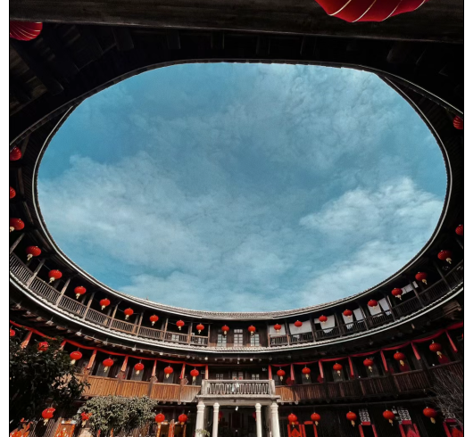 14:00 参观精美双环圆土楼——【怀远楼】,此楼建于清宣统元年(1909年),至今保存完好,文化底蕴深厚,是国家级重点文物保护单位,目前已被列入《世界文化遗产名录》。怀远楼坐落在梅林镇长教村,建于清宣统元年(1907年),楼高4层,楼内直径33米,每层34个房间。墙基用硕大河卵石和三合土垒筑而成,楼墙虽然只是普通夯土墙,但是夯筑技术炉火纯青,历经近百年的风雨侵袭,至今一片光滑,几乎没有剥落,让你感觉到时间只是从墙上轻轻划过,而没有留下痕迹;