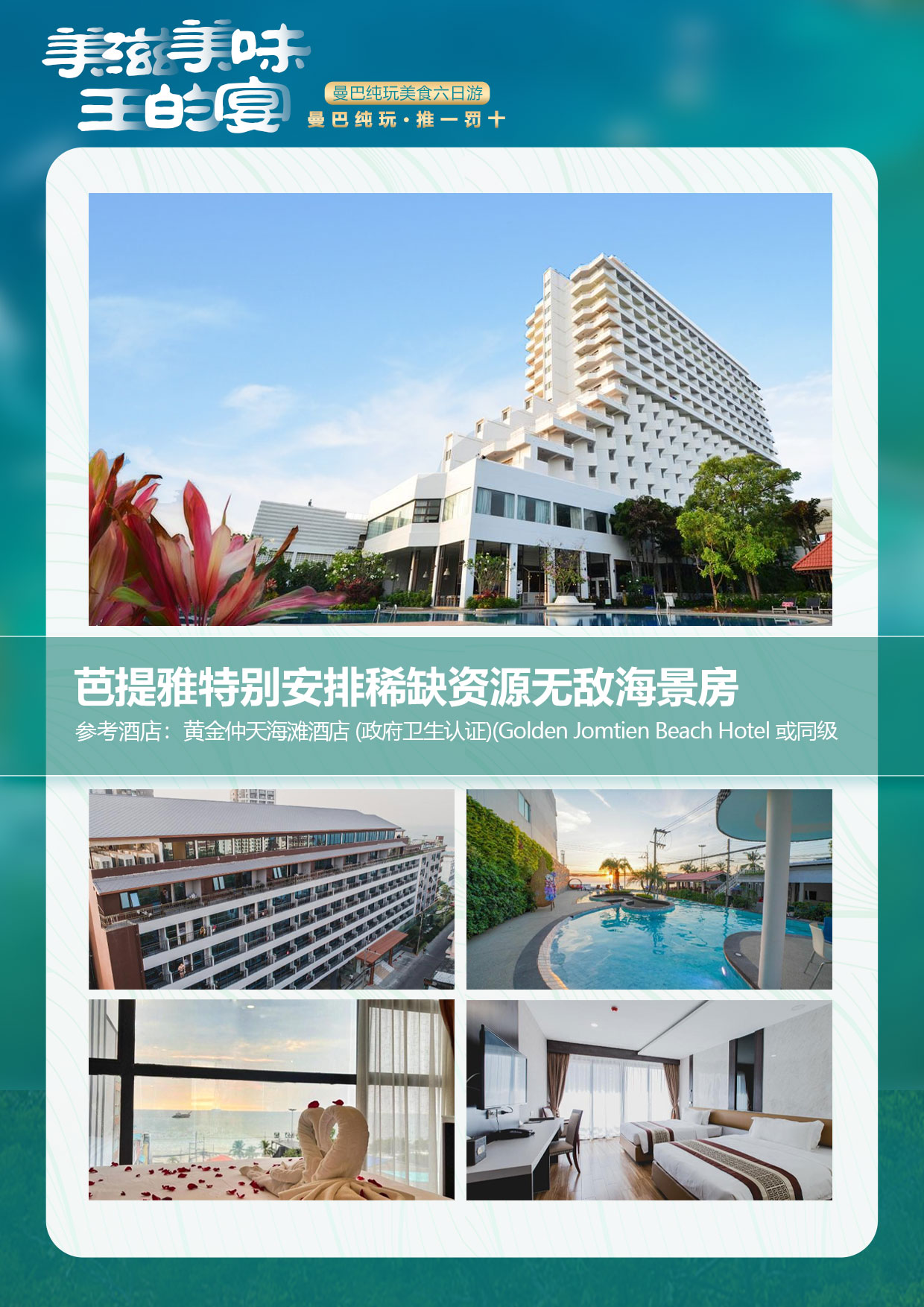 2晚芭提雅指定海景房:①D Varee Jomtien Beach Pattaya/芭堤雅中天海滩迪瓦尔酒店;②T Six 5 hotel/365酒店;③Way Hotel/维伊酒店4:Welcome jomtien/(或同级)