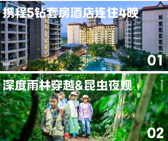 【住】西双版纳万达颐华全套房酒店或同级5钻酒店 【餐】酒店早餐、雨林大餐、雨林晚餐 -【活动地点】基诺山雨林 - 上午:【绿野仙踪】雨林穿越徒步、雨林野生秋千、彩石画脸(阿凡达妆)、动植物科普、生物多样性、清山环保行动、野生厨房雨林大餐 - 下午:【野外挑战】野外生存(庇护所)、攀爬绞杀榕、树降 【基诺非遗】基诺非遗体验:奇科音乐、大鼓舞体验 - 晚上:【夜探雨林昆虫】勇气挑战,昆虫欢乐聚会