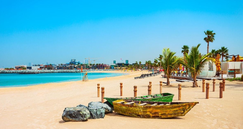 【朱美拉海滨浴场】,前方是波斯湾湛蓝的海水,背靠一排豪华酒店。除了酒店私有沙滩,这里可以公开穿泳装,也是欣赏和拍摄帆船酒店的理想之地。外观欣赏世界瞩目的用 24 吨黄金装饰的海上阿拉伯神殿【7 星级阿拉伯塔酒店】(又名:帆船酒店),曾是全球
