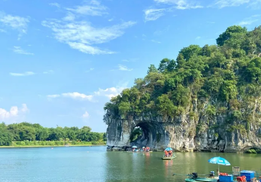 游览【象鼻山】象鼻山是桂林的城徽山,是桂林旅游的标志山,它坐落在桂林市中心的漓江与桃花江汇流处,形似一头鼻子伸进漓江饮水的巨象,象鼻和象腿之间是面积约一百五十平米的圆洞,江水穿洞而过,如明月浮水。坐落西岸的象山水月与漓江东岸的穿月岩相对,一挂于天一浮于水,形成"漓江双月"的奇特景观。